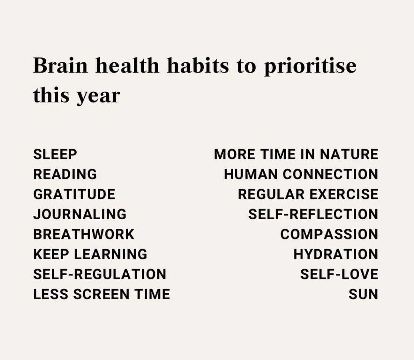 One of my favorite IG go-to’s when I need my brain reframed by a professional, is Nicole Vignola. She reminds us to “Look after your brain. Neurons cannot be regenerated once lost, and neurodegenerative diseases don’t start when you’re 60. They start in your 30’s and 40’s.” Yikes, let that be a reminder to us all how important the habits below are to our long-term well-being and the quality of life during the latter stage of our lives.